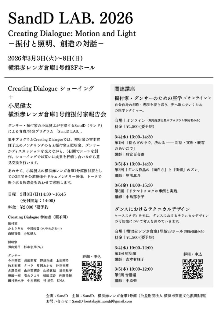 2026年3月6日(金)に横浜赤レンガ倉庫1号館でダンサーのためのレクチャーを行います。こちらは②振付家・ダンサーのための座学、SandD 育成/開発プログラム SandD LAB. 2026関連企画の一つで、一般の方もオンライン聴講可能です。